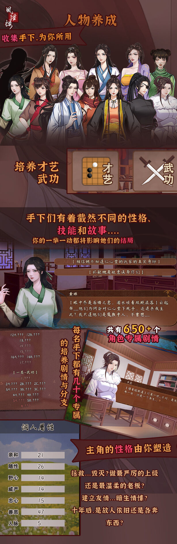 昏君误国,怨声载道,无数野心家暗起反心。在京城一家青楼的掩饰下,你培养手下、积攒钱财、收集情报、建立人脉,等待兵变夺权的最好时机……《风信楼》是一部拥有海量选项和丰富剧情的高自由度养成游戏——百种不同结局,尽在你的选择之中。