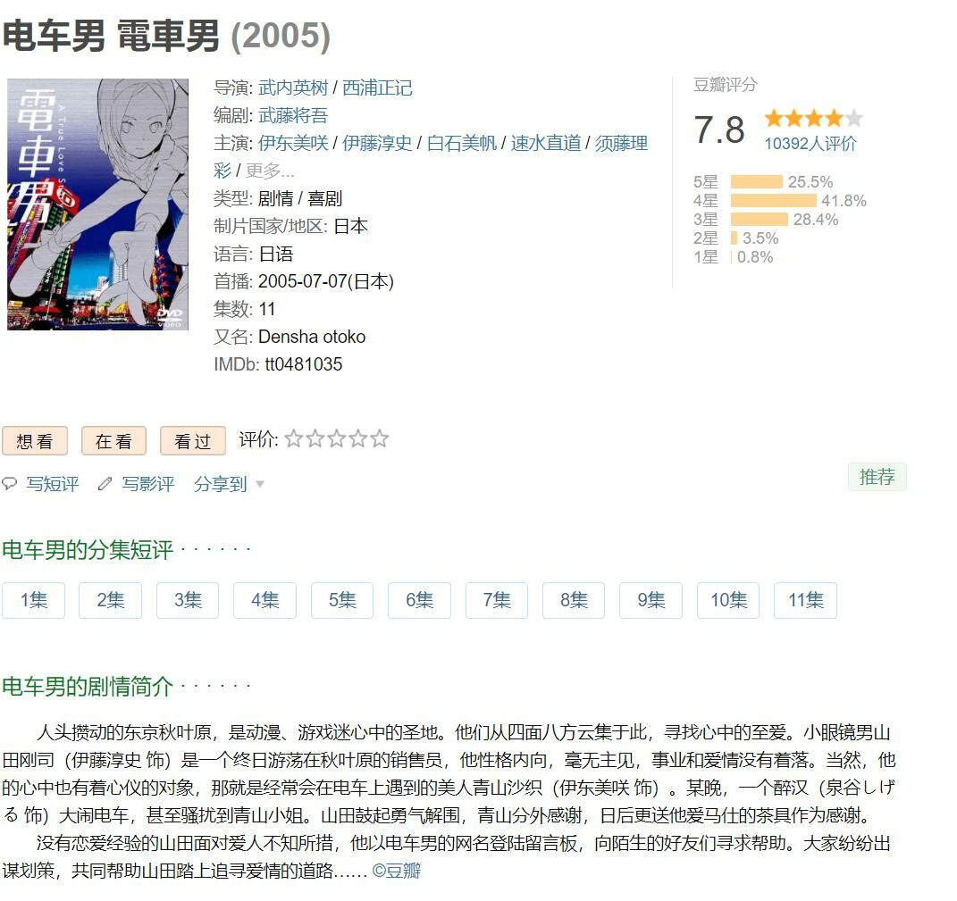 人头攒动的东京秋叶原,是动漫、游戏迷心中的圣地。他们从四面八方云集于此,寻找心中的至爱。小眼镜男山田刚司(伊藤淳史 饰)是一个终日游荡在秋叶原的销售员,他性格内向,毫无主见,事业和爱情没有着落。当然,他的心中也有着心仪的对象,那就是经常会在电车上遇到的美人青山沙织(伊东美咲 饰)。某晚,一个醉汉(泉谷しげる 饰)大闹电车,甚至骚扰到青山小姐。山田鼓起勇气解围,青山分外感谢,日后更送他爱马仕的茶具作为感谢。
