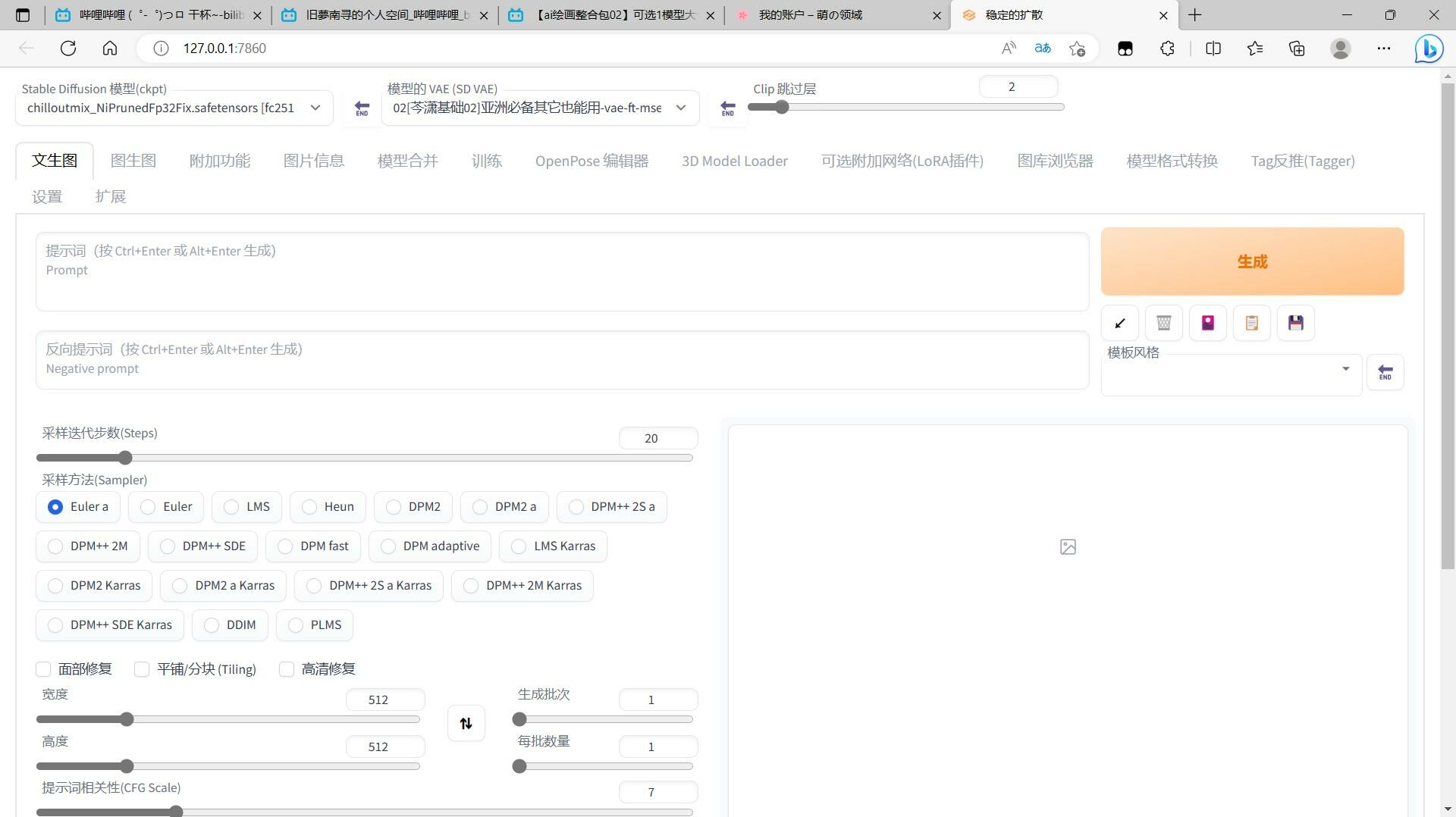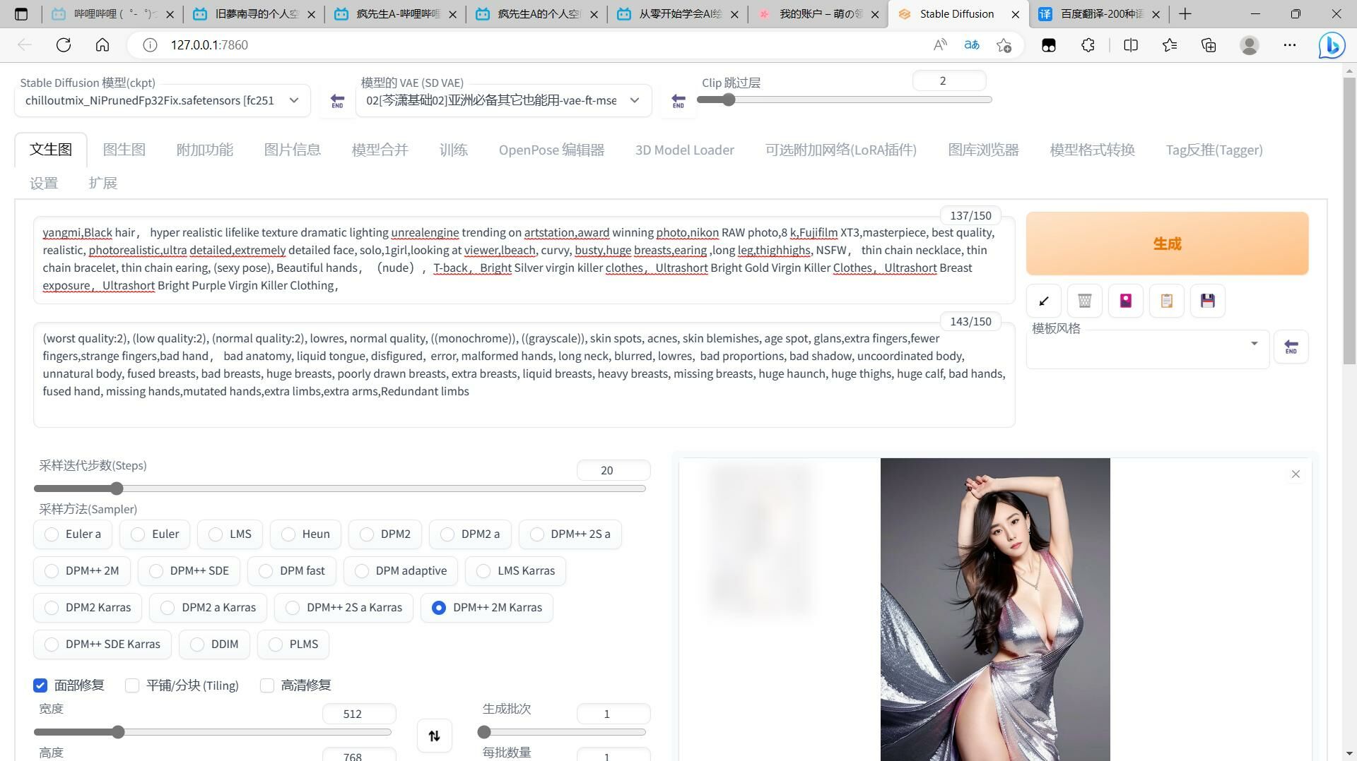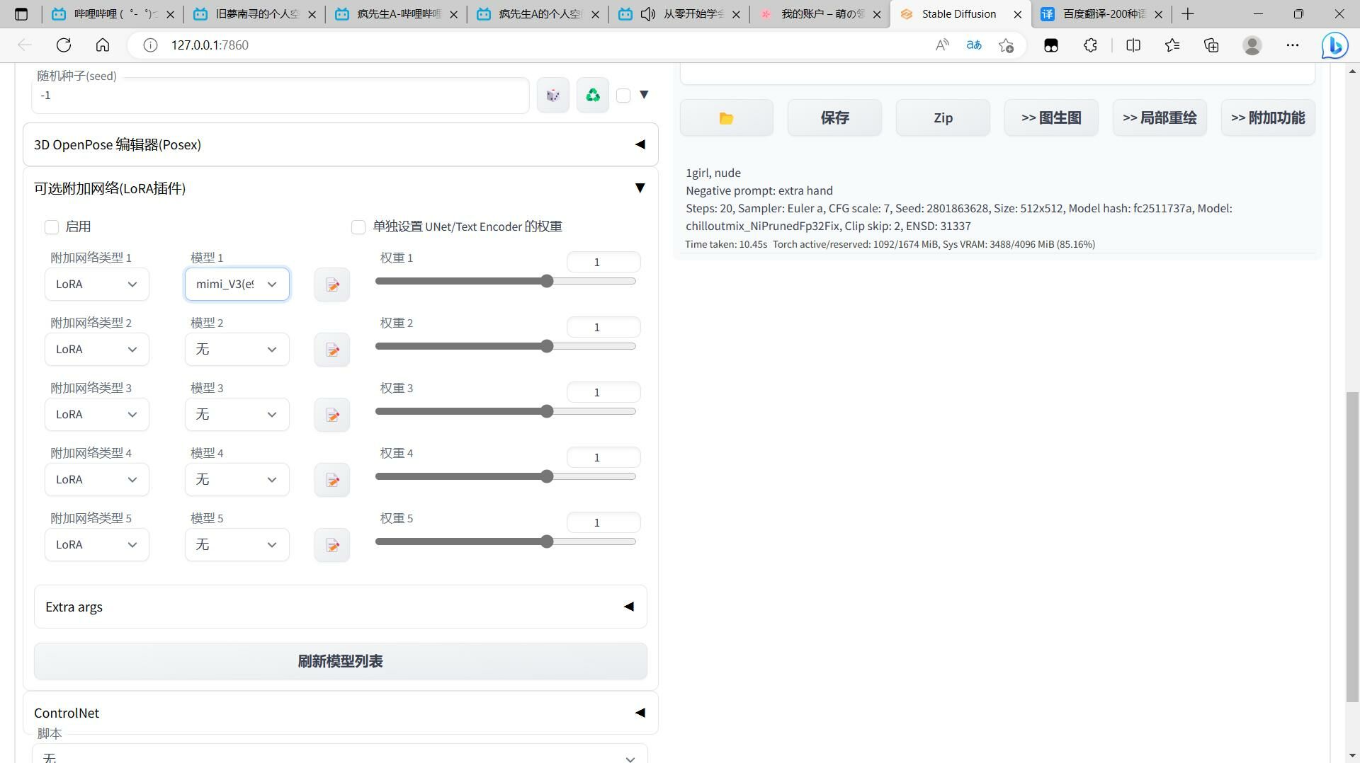 然后就是lora插件,这个东西用好了可以生成各种好康的东西,模型这里可以选择各种lora,权重可以调节这个lora的工作情况。还可以多个lora组合使用,比如加载上某个人的lora,再加载上一些瑟琴动作的lora,你就可以得到一个对着你做瑟琴动作的她。