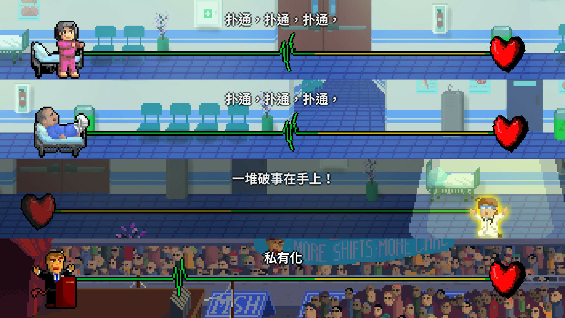 - 怪诞的剧情设定(你需要扮演心脏急救的医生,而你需要面对的病人则千奇百怪)。