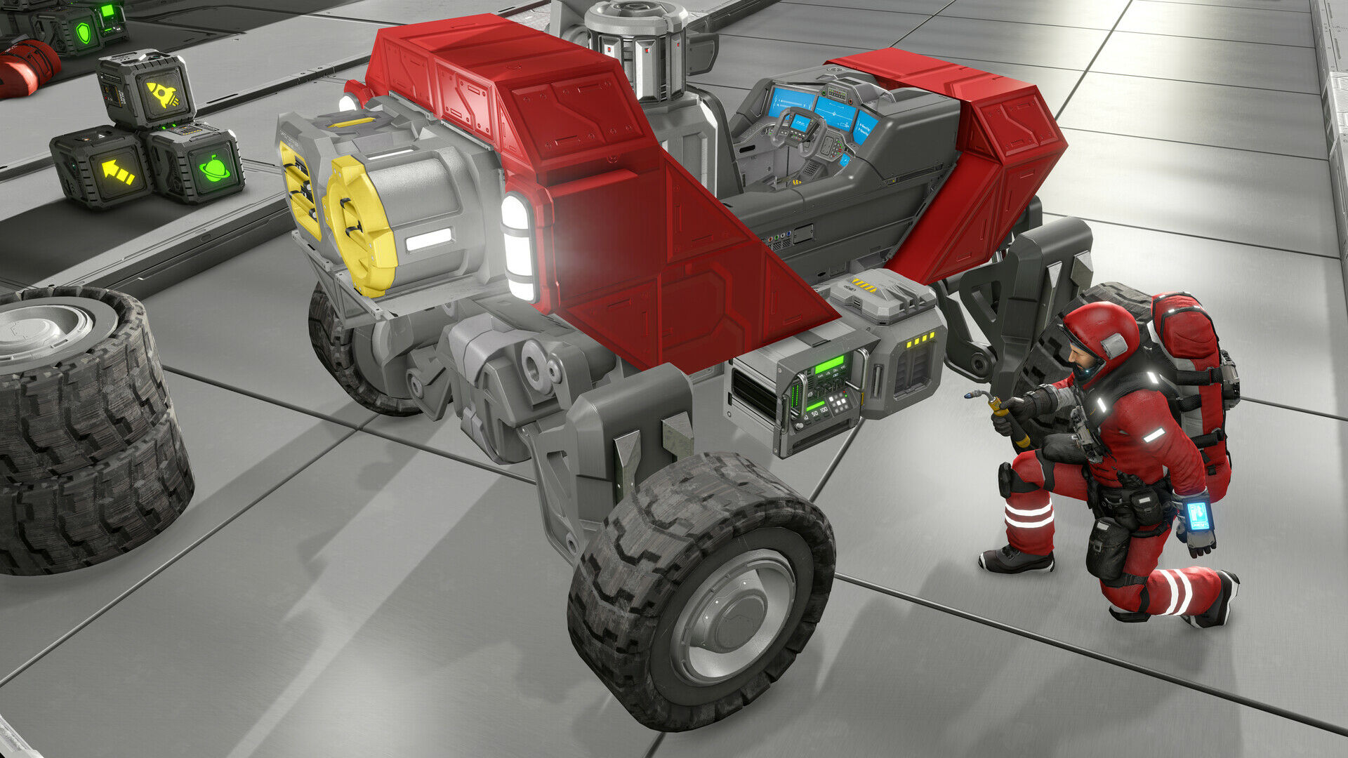 《太空工程师》使用了内部构造的VRAGE 2.0,真实体积的物理引擎:所有物体都可以被组装,分解,损坏和破坏。
