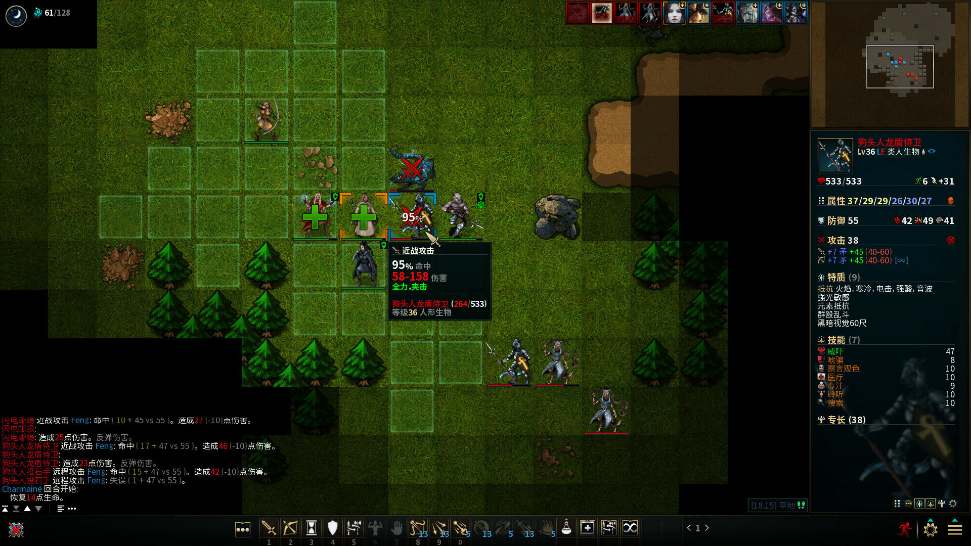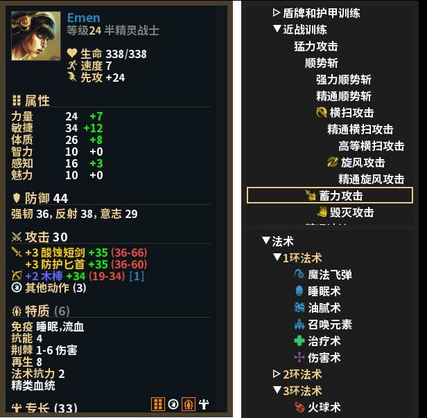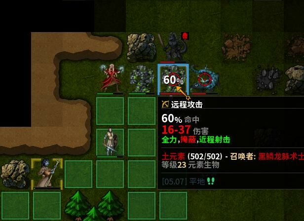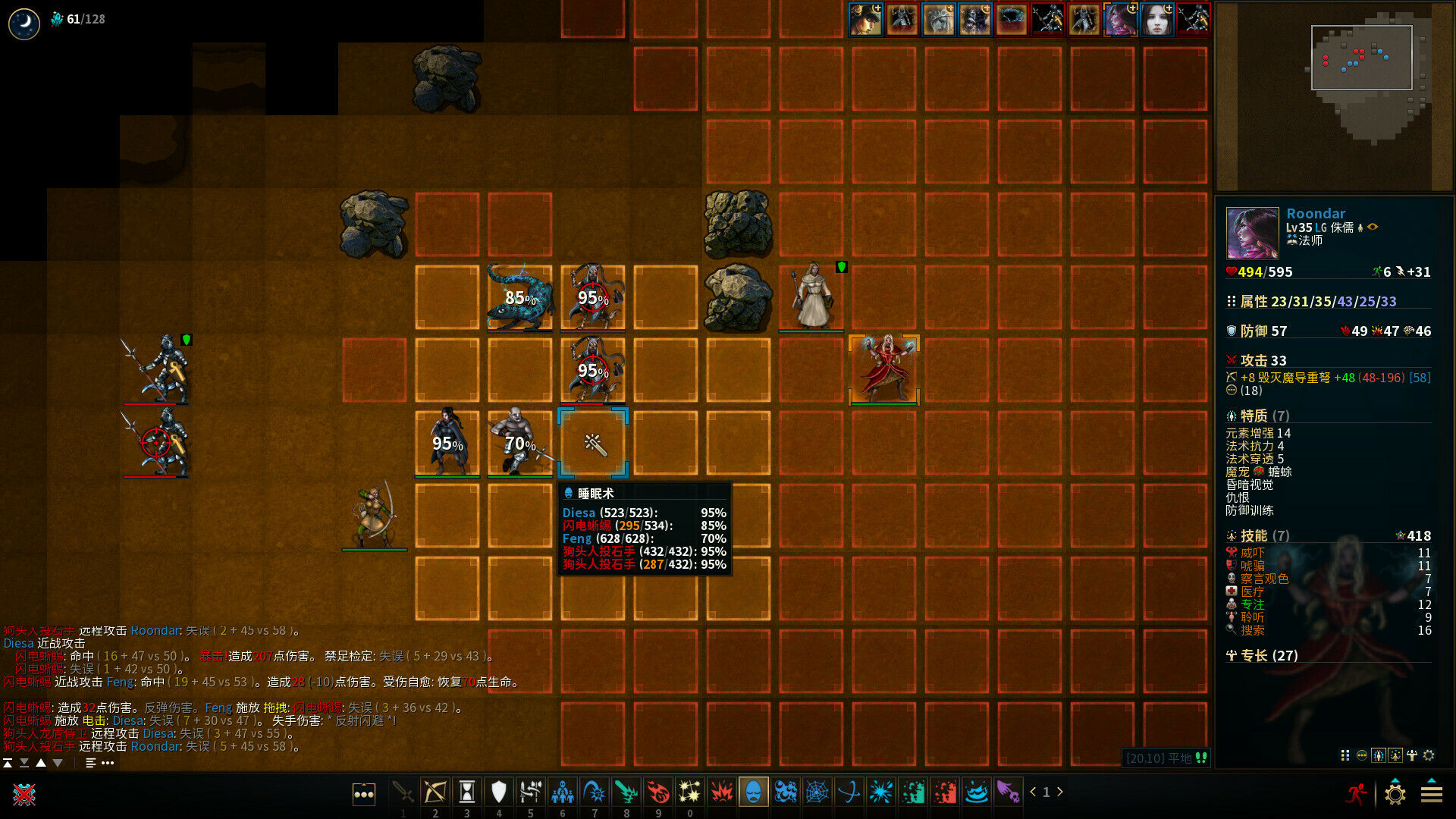 - 精心设计的技能/法术:战系专有的各种范围武器技,打破了传统战士只会平砍的尴尬局面;精选并强化的睡眠术/油腻术/召唤元素等各种奥术/神术,让玩家在面对同一战况时有多种解决方案;各种怪物特有能力及其造成的变形/恐惧/疯狂/魅惑等特殊状态,使战斗始终保持一定的挑战性。