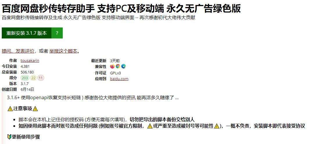 【秒传】关于如何恢复秒传以及如何使用 技术教程, 野生技术协会 2年前 爱丽丝喵 - 12 我使用了文中方法,能够保存秒传了。 最后审核由 龙姐 UID:1 网址【https://greasyfork.org/zh-CN/scripts/468633】 当然,可能存在风险,请各位站友自己决定,反正我在用(主打一个怕不用,用不怕……) 若是各位不放心,也可以等过段时间,看看我有没有被封再用。。。0.0 如果G了,号上2T资源估计就无法分享了,不过我还有几个T的本子在电脑硬盘上,并且以每天增加50至100本的数量增加,有空可以慢慢分享。。。