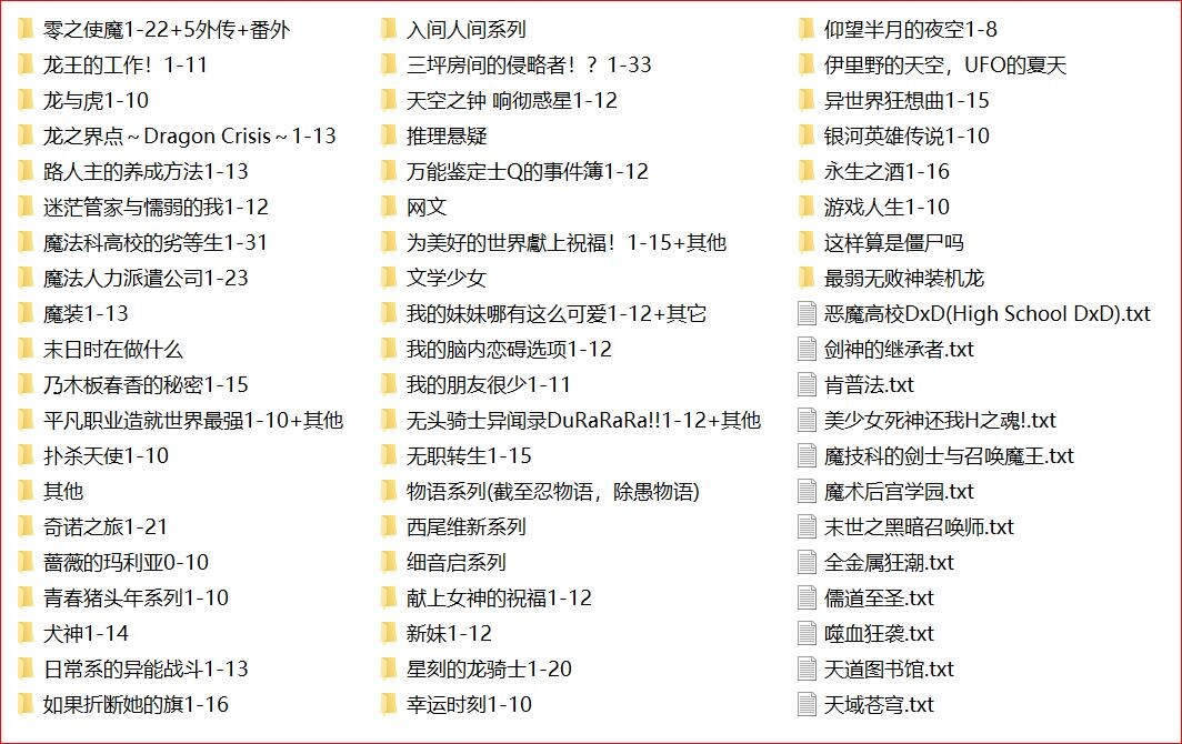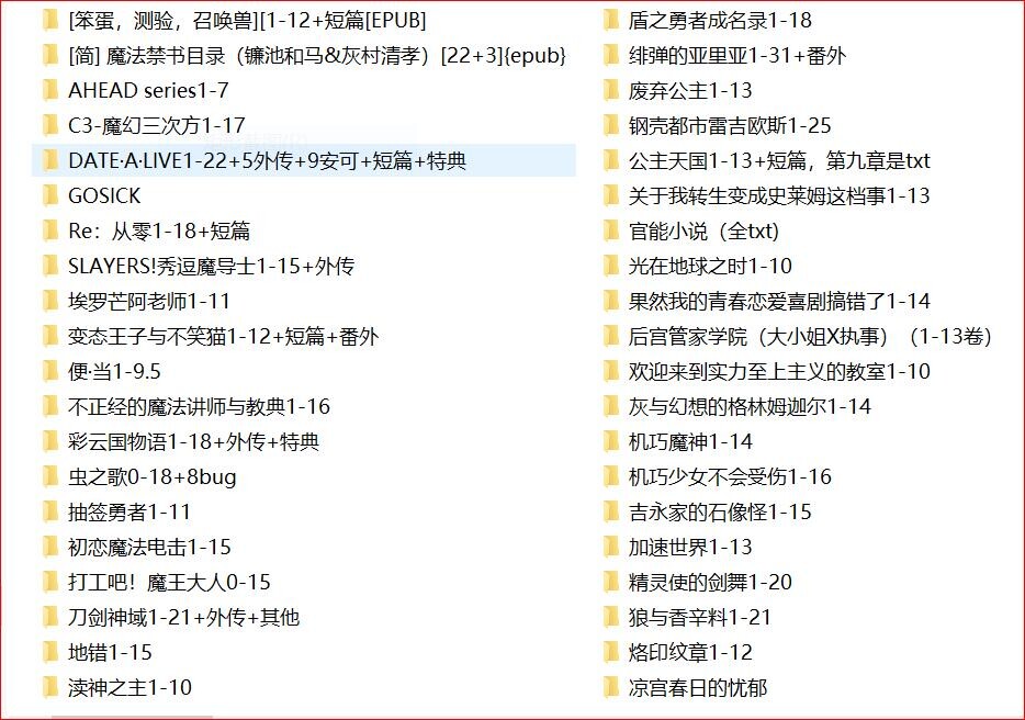 【轻小说】轻小说合集EPUB【6G】 轻小说 5年前 画伊人 - 34 给大家分享一下我找来的一些轻小说资源,大部分都是EPUB。嗯,里面还有一些网文什么的。我不是资源帝,可能比不上站里的大佬们,但是量大管饱。 最后审核由 龙姐 UID:1 不多说了,看图。 现已统一用了秒传补档,部分压缩包解压码为 wen