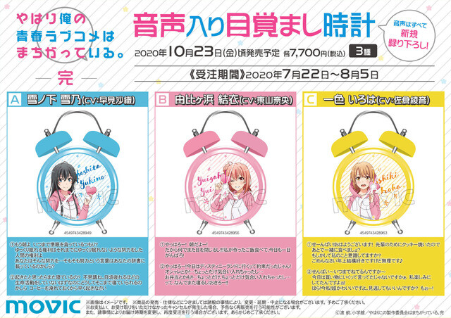 “《我的青春恋爱喜剧果然有问题。完》全语音闹钟”的价格(三款)均为7700日元(含税)。在「アニメイト」(Animate)、「アニメイトオンラインショップ」(Animate Online Shop)和「ムービック通信販売」(movic)上的预约2020年8月5日截止,预计10月23日发售。