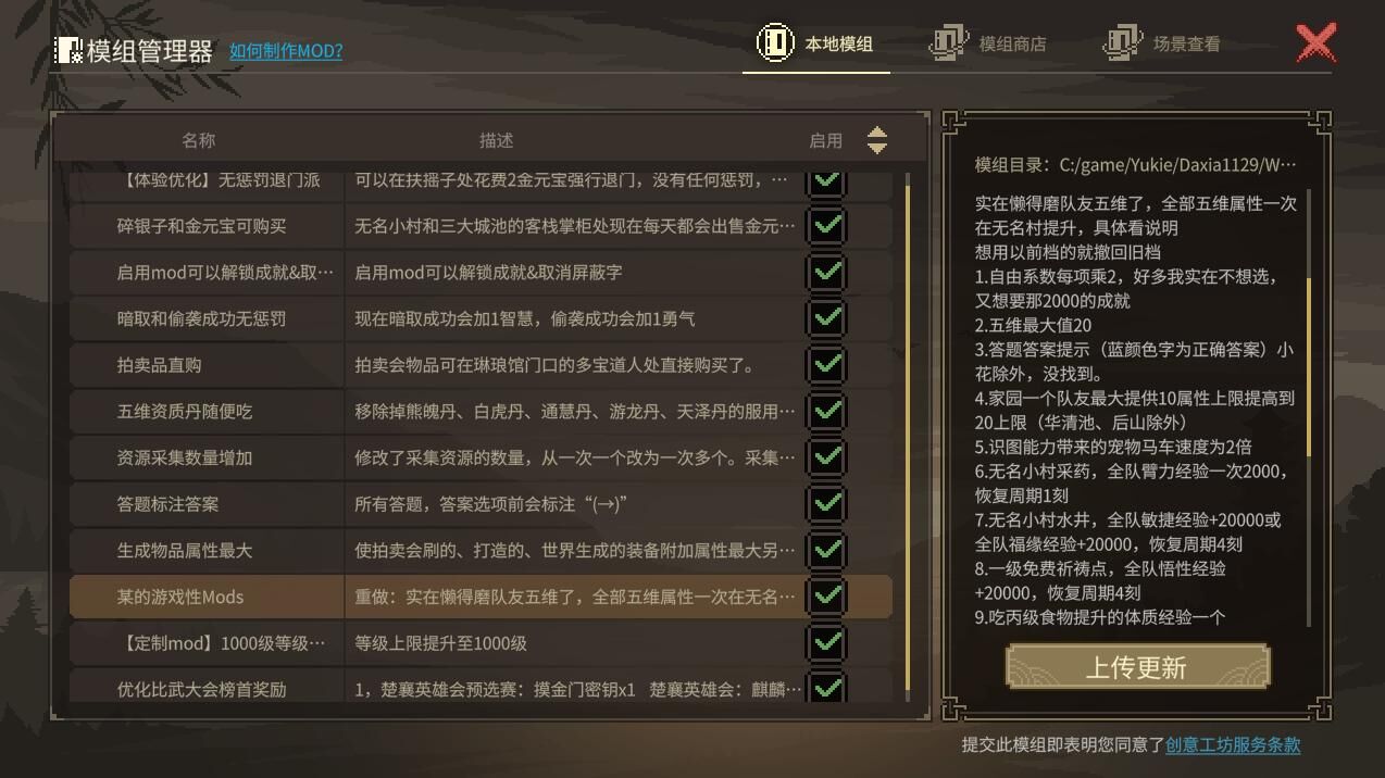 除了1000级上限那个mod目前不知道效果外(游戏原来是100级上限,我现在只玩到50级),别的mod都能正常起效。资质丹取消服用次数限制那个mod据说启用后再关掉会出bug,所以开档启用了这个mod就用到结束吧。
