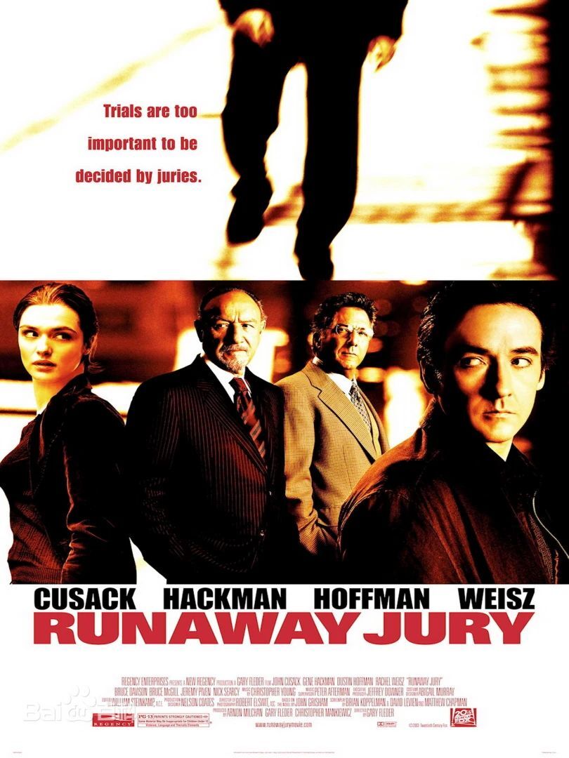 《失控的陪审团》是由二十世纪福斯电影公司发行的剧情片,由加里·弗莱德执导,约翰·库萨克、达斯汀·霍夫曼、吉恩·哈克曼、蕾切尔·薇姿主演,于2003年10月17日在美国上映。影片改编自约翰·格里森姆的同名小说,讲述了在一起震惊全国的枪杀案审判中,陪审员之一的尼克与场外的玛丽两人控制着12名陪审员投票结果的故事。