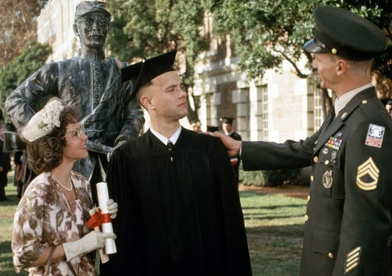 阿甘(汤姆·汉克斯饰)是个智商只有75的低能儿。在学校里为了躲避别的孩子的欺侮,听从一个朋友珍妮(罗宾·怀特饰)的话而开始“跑”。他跑着躲避别人的捉弄。在中学时,他为了躲避别人而跑进了一所学校的橄榄球场,就这样跑进了大学。阿甘被破格录取,并成了橄榄球巨星,受到了肯尼迪总统的接见。