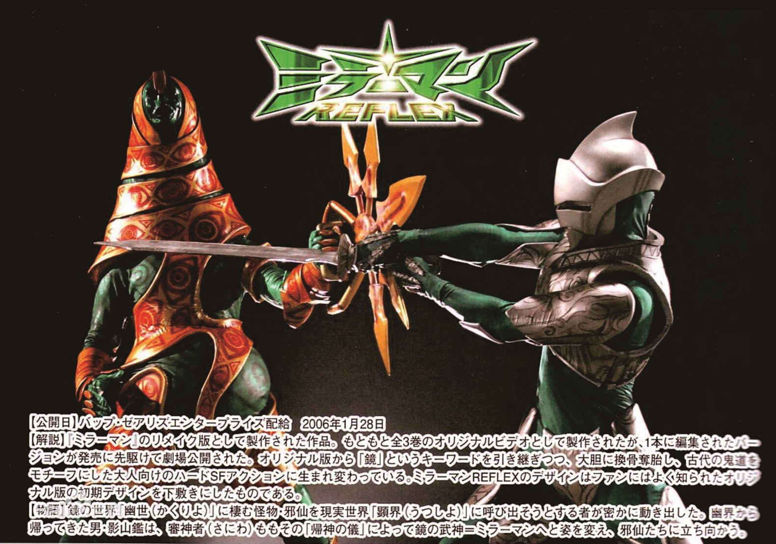 【特摄】镜子超人reflex 动画, 完结番剧 5年前 超级鹅鹅 - 1 镜子超人REFLEX是在2006年发售的特撮作品。为圆谷公司发布的《镜子超人》系列OV,共3部,可以理解为其重置版本。 以神秘色彩和神话色彩展开的作品,采用监控摄像,镜里镜外等拍摄手法,向观众们展示了宏大的世界观。 最后审核由 龙姐 UID:1 镜子超人REFLEXミラーマンREFLEX(ミラーマンリフレックス)是在2006年发售的特撮作品。全3话,是以“镜子,冥界”为主题的系列作品,后来将被编译成电影,和原版镜子超人没有任何联系,镜子超人REFLEX比原镜子超人的前半部分更黑暗。