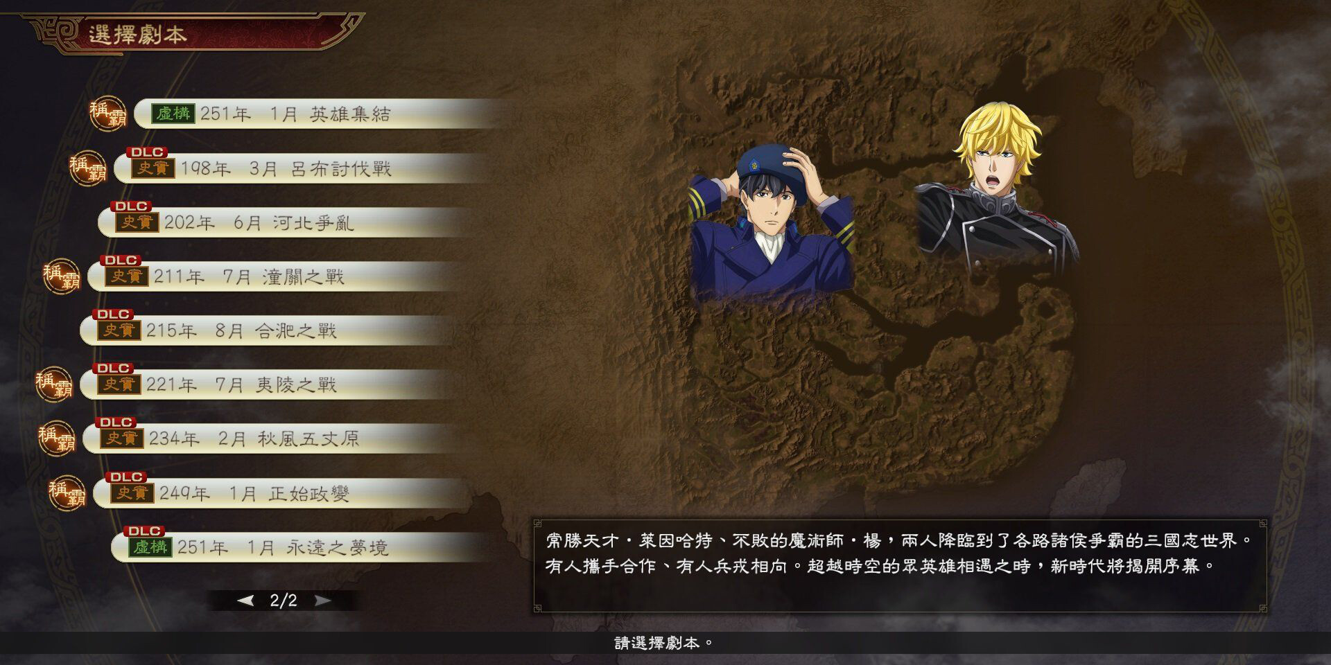 合作剧本《永远之梦境》中将会有名为“帝国”及“同盟”的《银河英雄传说 Die Neue These》中的两大势力登场,且两势力各有本剧本专用的爵位,可以任命相关的官职。当然,不止是“银英”的势力,在三国志时代争夺霸业的各个势力也将齐聚一堂,并以统一中华大地为目标,蓄势待发。