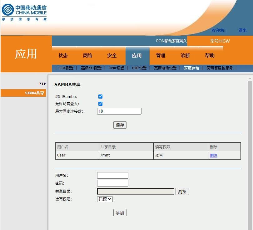 有些人家里可能有安装家庭网关之类的比较高级的路由器,比如我家是移动的家庭网关,这种设备也是支持SMB协议的,可以利用这种设备存储文件,这样电脑就不需要一直开着来充当服务器了。